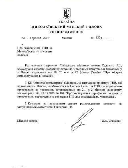 Тверді побутові відходи (ТПВ) зі Львова будуть тимчасово приймати в Миколаєві, повідомив вчора мер Миколаєва Олександр Сенкевич.